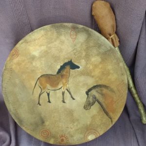 This drum is small yet makes a lovely resonant sound. The painted horses on it are so evocative of a cave painting – they have been done brilliantly.This is my first drum and I’m enjoying finding my own way of playing this. Hellis