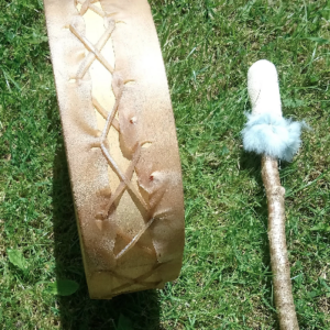Double sided small drum- can have sand/shells put inside to create ocean drum. This is made from Cow Hide.