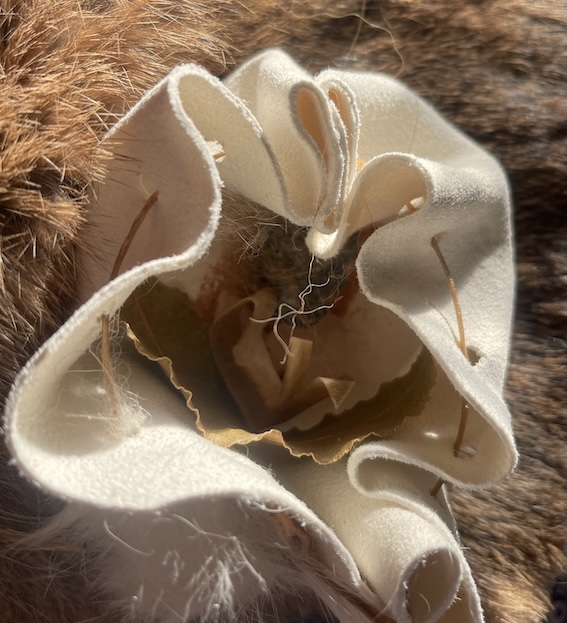 The drum beater is made from hazel wood collected from my summer trip to County Clare – symbolising wisdom, inspiration, and poetic sight. It has a plain chamois beater head, softly stuffed with local alpaca wool, decorated with rabbit fur.