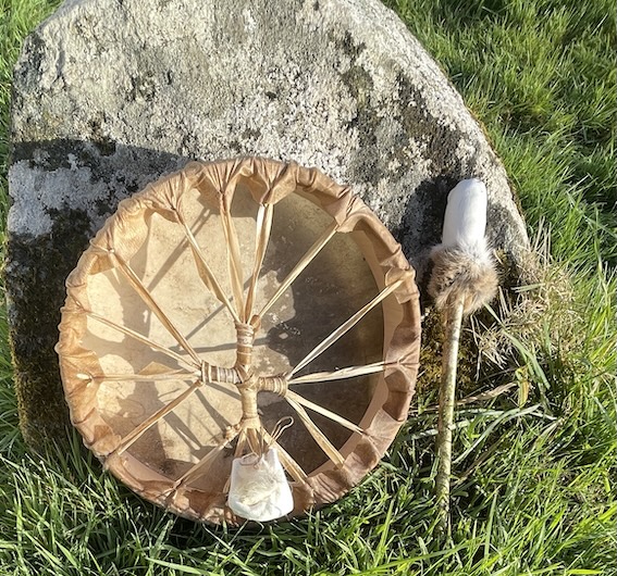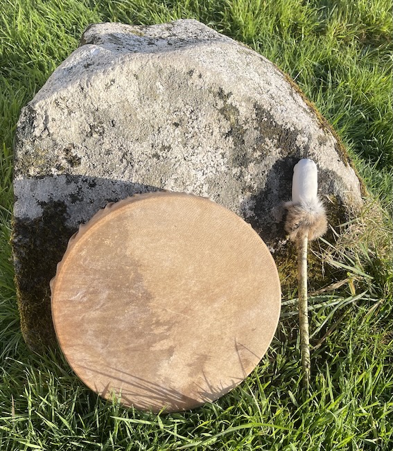 This drum was birthed under the Preseli Mountains, close to the ancient bluestone quarry from which the stones of Stonehenge were taken. This land holds memory…of ceremony, migration, star knowledge, and stone wisdom.