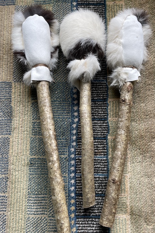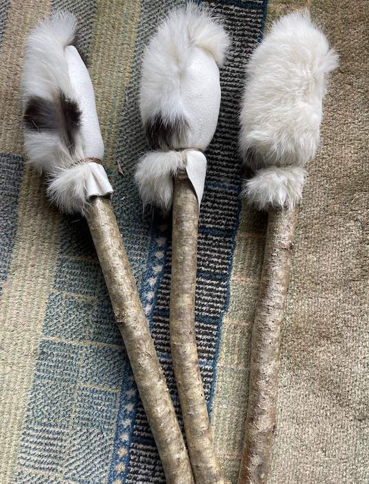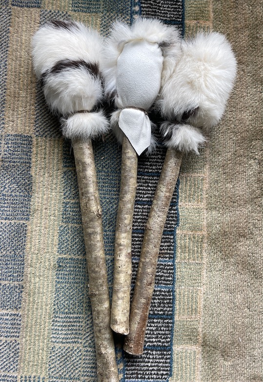 Fur and chamois drum beaters with hazel handle. hand made- recycled fur- maybe jack rabbit.