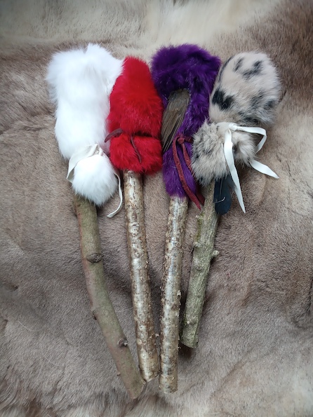 Rattles made from cow & deer hide, natural and dyed rabbit fur. (custom made ones available, please message) My drums and rattles are handmade in ceremony with prayers and blessings, in a beautiful natural setting known as Dolwilym, West Wales. All designs vary and may have feathers, wings, beads, crystals included.