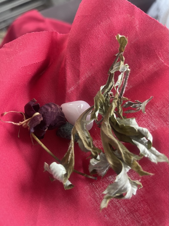 Within the medicine bundle rests a bluestone, a rose quartz and dried dark red red rose from my altar, dried mugwort for dreaming, and the umbilical knot of the drum.