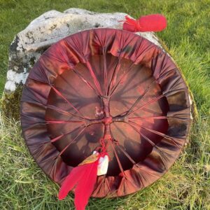 Using natural and traditionally prepared, naturally dyed* deer hides and timbers you with birth a sacred drum. Hoops are crafted from Ash, the world tree. Beaters are made from locally coppiced wood, stuffed with raw sheeps wool.
